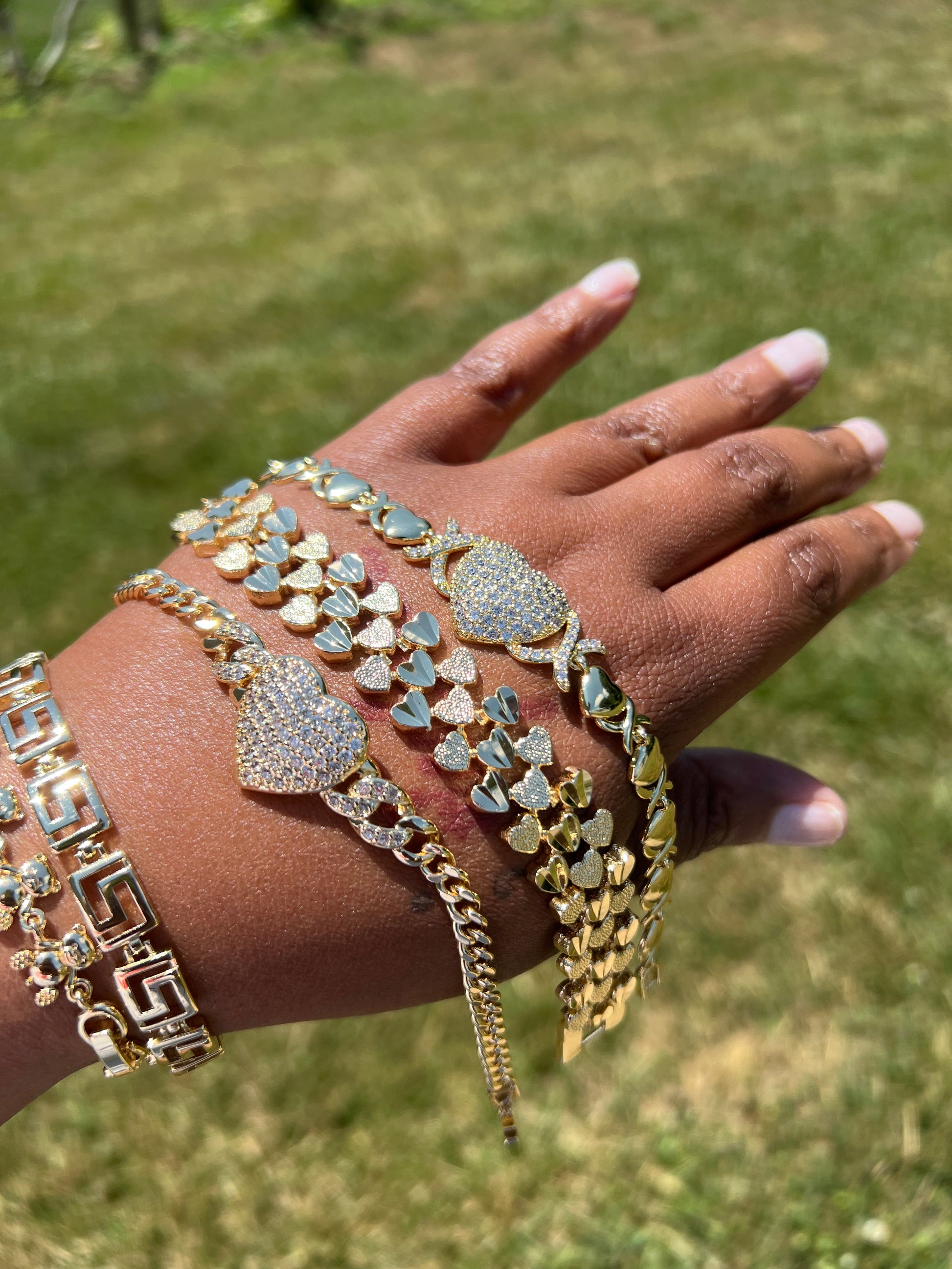 3 piece set includes 2 cz hearts and 1 all gold heart bracelet